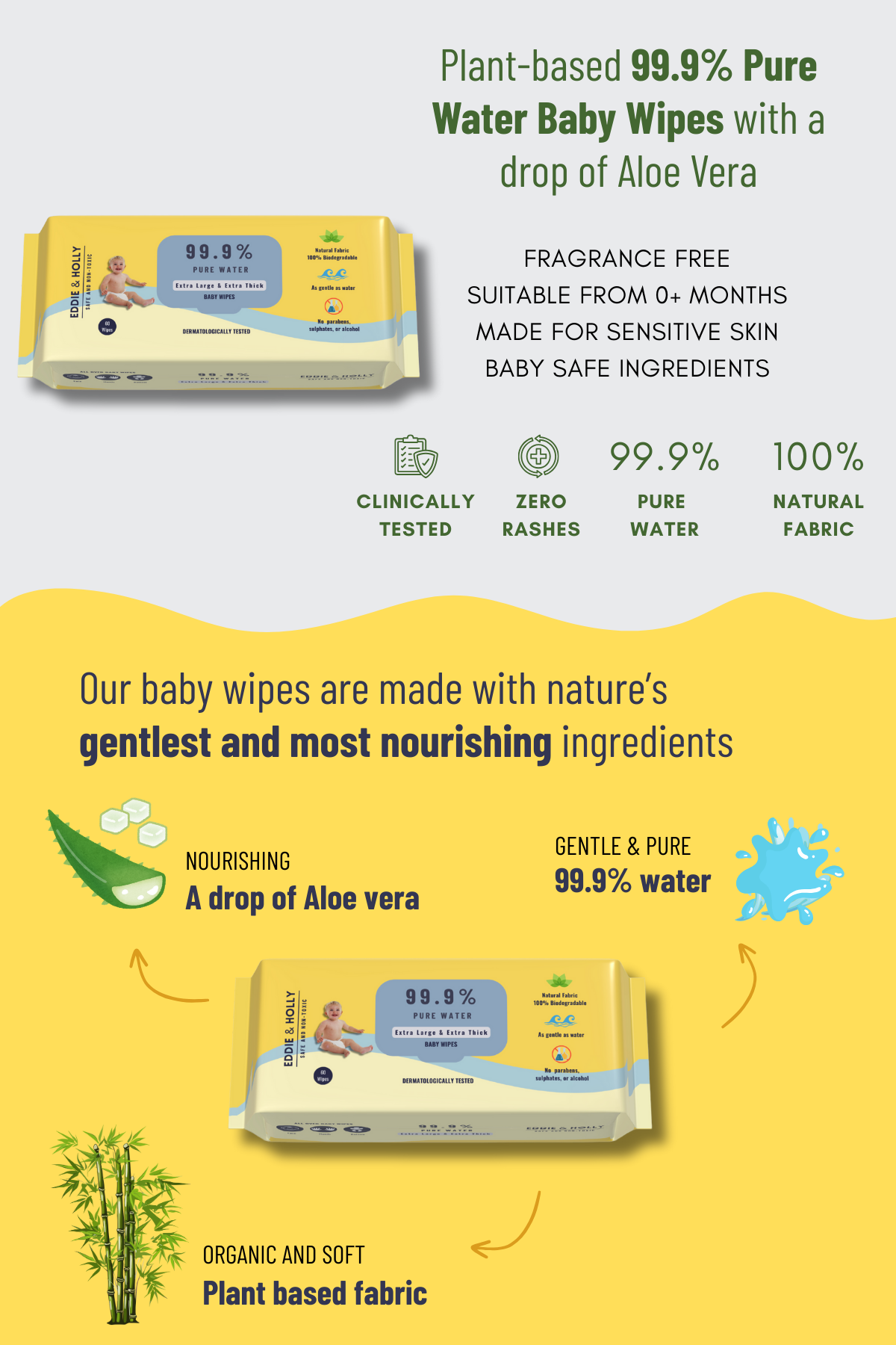 99.9% Water + Aloe: Pure, soothing wipes for delicate baby skin.