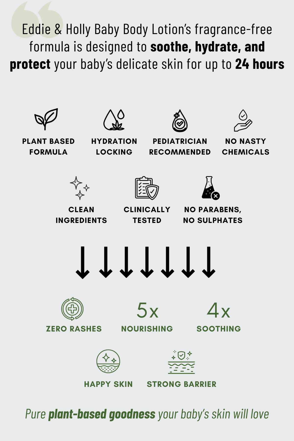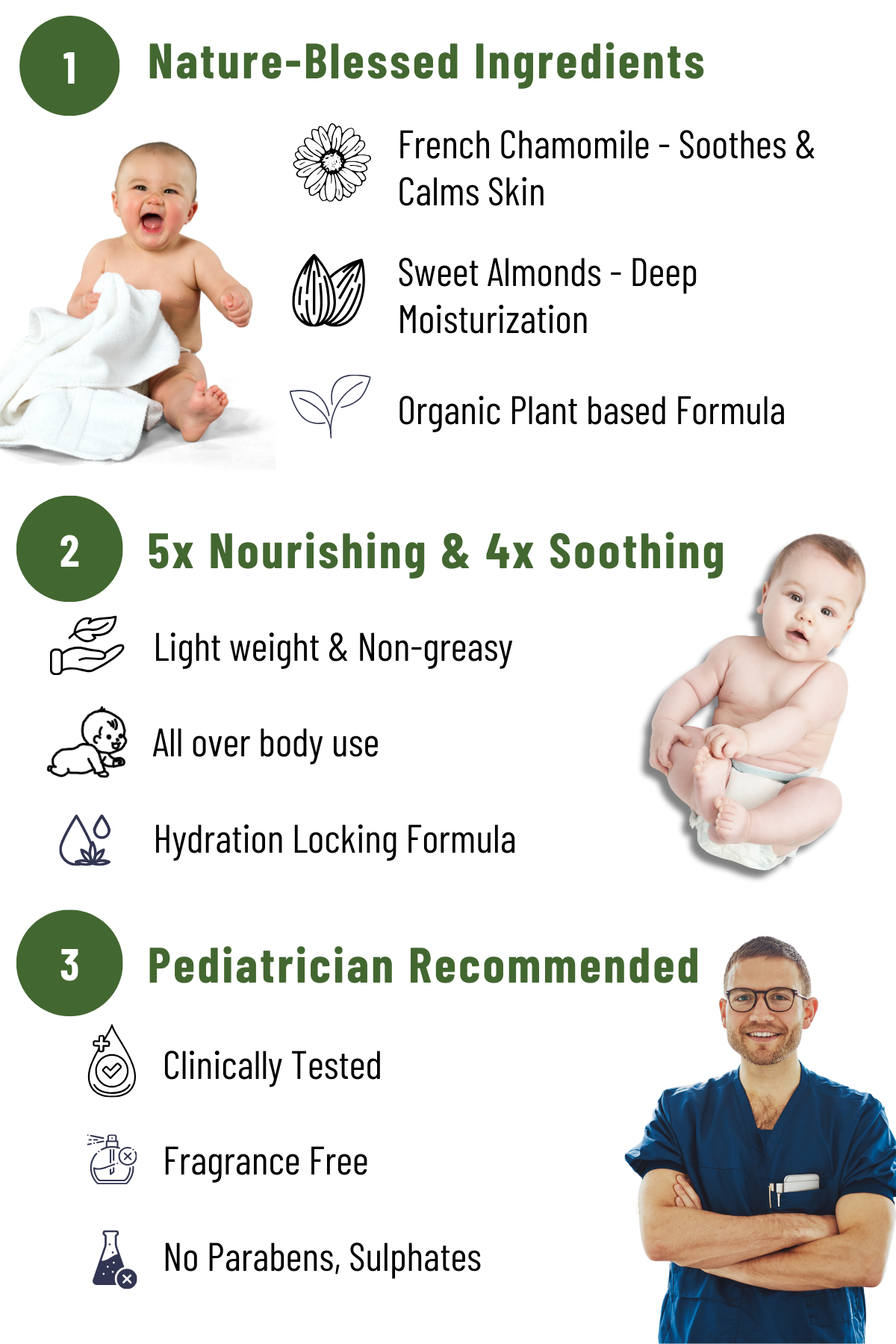 ✅ NON-GREASY & LIGHTWEIGHT: A fast-absorbing, non-sticky formula that locks in moisture without clogging pores, keeping your baby's skin fresh and comfortable.