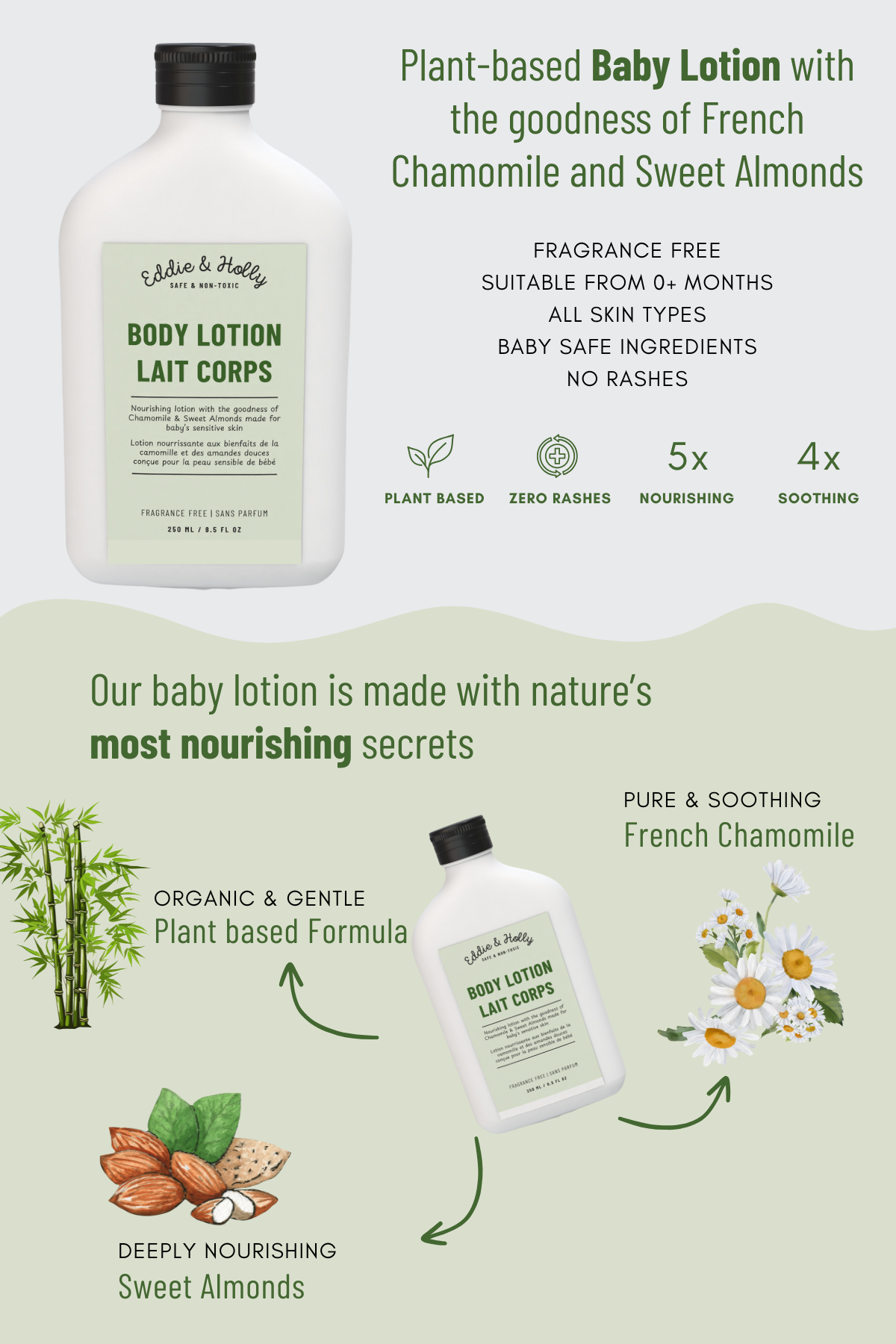That’s why we created a lotion that’s as gentle as your love, with nourishing almond oil and calming chamomile.